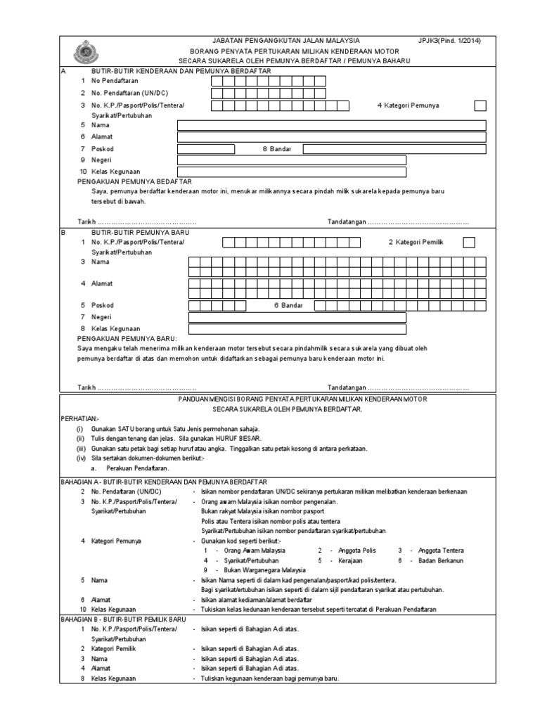 Borang Penyata Pertukaran Milikan Kenderaan Motor Secara Sukarela Oleh Pemunya Berdaftar Jpj K3 Pdf